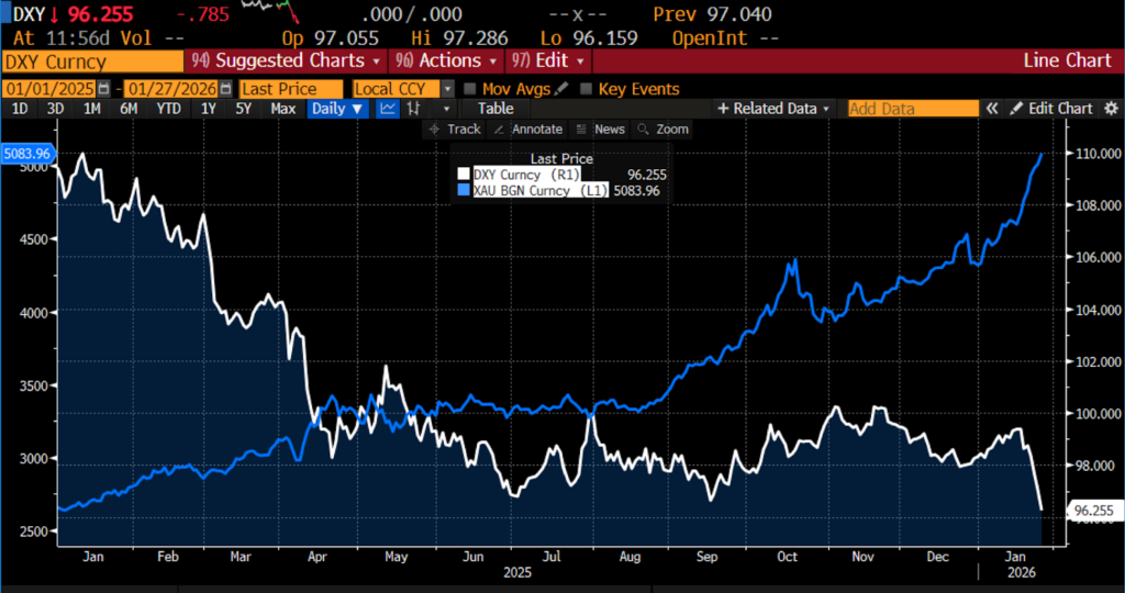 US Dollar Index versus gold price per ounce, Jan 2025 – present